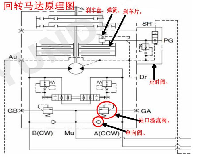 要了解挖掘机回转刹车失灵的问题,首先要了解回挖掘机回转刹车的液压原理,如果原理上搞不清,刹车失灵的问题即使靠侥幸让你蒙对了,下次再发生怎么办?所以扎扎实实弄懂原理,是解决各种问题、故障的关键。开过挖掘机驾驶员都能看到,回转马达与挖掘机的外形相比是很小的,二十吨级的挖掘机它把大小臂伸展肯定有十米以上,如此大半径的转动惯量,要把它立刻停止转动,也得破费一番周折,如果光“靠摩擦止推片”止转是远远不够的,必定要在液压制动有所考量,通过对回转液压原理的了解我们知道,回转的刹车有两部分合成所致;一个是液压制动,一个是液开机关的刹车片机制,所谓液开机关的刹车片机制;当挖掘机要转动时,首先是液压油克服弹簧力顶开刹车盘,松开刹车片,当关闭时,是有刹车盘上弹簧产生的弹簧力锁紧刹车片,是机械式关闭。