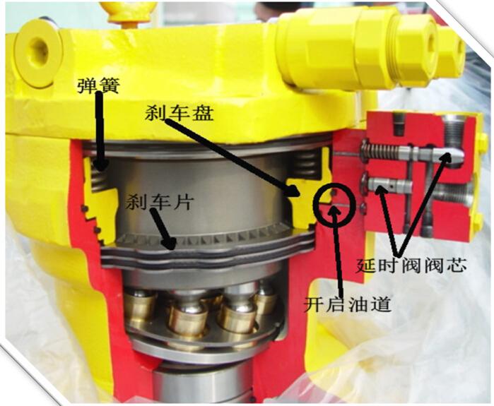 那么它刹车的功能是如何工作的?这里我简单叙述一下;在叙述之前,在回转马达上还有一个十分重要的部件——延时阀。延时阀虽是这样命名,但从原理上看,它的功能就是起缓冲的作用,你试想,如果没有延时阀参与缓冲,当伸展大小臂的挖掘机在快速回转中,突然的松开手柄,回转得到急刹停顿,就会造成硬碰硬冲击,这对液压马达、减速器内部的结构件会造成损坏。所以刹车开启与关闭的功能是从延时阀开始的,工作步骤;在延时阀上设有两股油道,一股是开启油道,它来自先导泵,另一股来自回转操作手柄,1、只有当手柄移动时,来自手柄的先导油推开延时阀阀芯,2、来自先导泵的工作油路才能顶开刹车盘(相当于盘型活塞)放松刹车片,挖掘机开始转动。当放开回转操作手柄,相当于停止转动,刹车盘通过弹簧力向下收紧刹车片,同时把油腔的液压油排入延时阀内专设的阻尼小孔,让油腔内液压油回流入油箱能延时间,因此刹车不是急刹,而是缓刹,起到缓冲的功能。所以一旦当回转时,刹车无法控制,那么最常见的故障——延时阀脏堵。使得刹车盘无法压紧刹车片。