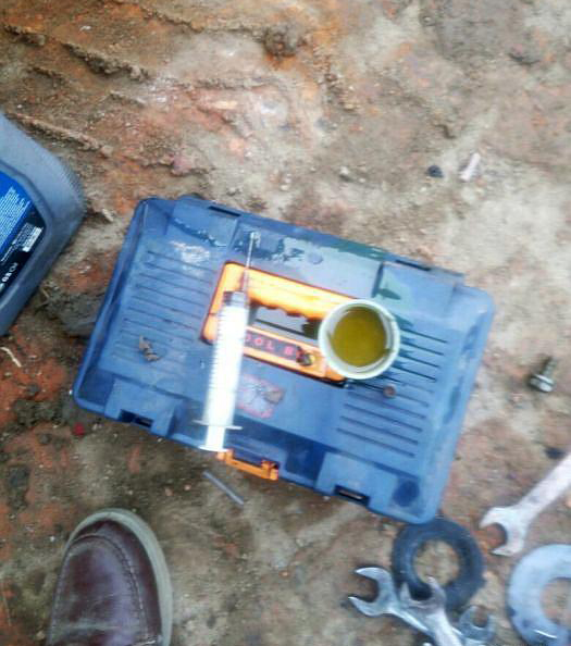 螺丝拧下来,药针吸满油就可以直接往里打啦,得50毫升左右,慢慢来不能急,否则油都出来了,要给它排气的时间。开始想加机油啦,把拖拉机机油压力表管直接拧上发动着直接压力打入,一看油管不行拧不上。只能笨方法啦。